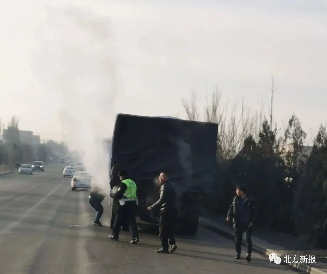 當(dāng)日,包頭市公安局交管支隊(duì)東興大隊(duì)第三警務(wù)區(qū)民警裴少華、孫建波、趙永來(lái)三人巡控至包白公路黃草洼村口北200米處時(shí),發(fā)現(xiàn)迎面駛來(lái)的重型半掛牽引車(chē)左后側(cè)有濃煙飄出,隨即將其攔停,此時(shí)車(chē)底已岀現(xiàn)明火,三人迅速拿起滅火器,并前往附近商戶打水全力滅火,20分鐘后火被撲滅。經(jīng)過(guò)初步了解,火源為剎車(chē)抱死導(dǎo)致。