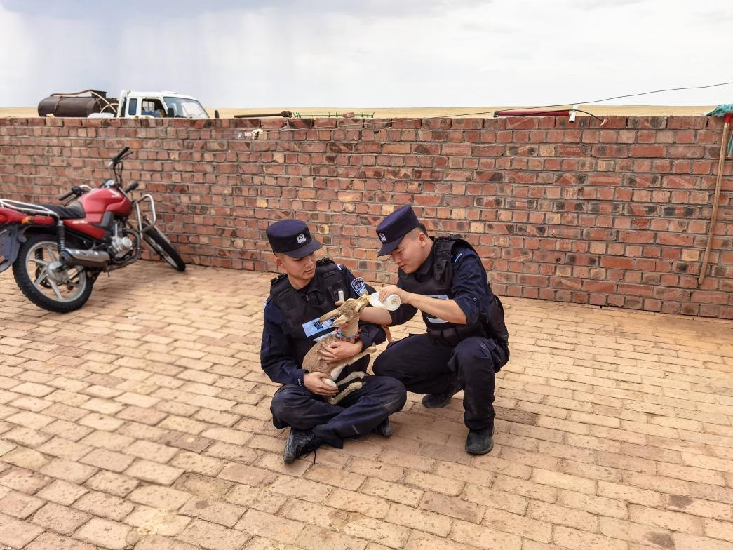 7月9日,甘其毛都邊境派出所民警與護(hù)邊員寶日夫在開展日常巡邊工作途中,發(fā)現(xiàn)一只受傷的黃羊幼崽伏在地上瑟瑟發(fā)抖。經(jīng)檢查,這只小黃羊年齡約為4個(gè)月,左后肢疑似扭傷,無法正常行走,身體也極為虛弱。民警立即將小黃羊帶到護(hù)邊員寶日夫家中包扎救治。寶日夫夫婦還為小黃羊做了一個(gè)項(xiàng)圈掛在脖子上,希望它盡快痊愈,茁壯成長。
