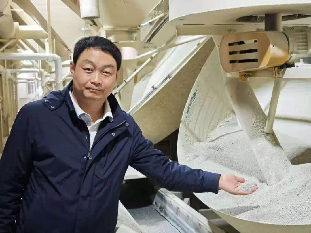 張文瀚向記者介紹膨潤土貓砂生產流程