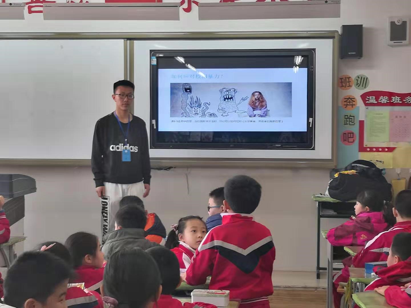 只見一個長相魁梧的“歹徒”不僅擋住同學們回家的路,還口出狂言。而路過的幾名同學正不知所措。原來這是由北垣小學的師生們正在進行校園暴力演習,且當天還邀請了52位律師走進校園,為同學們上了一堂生動的法律常識課。