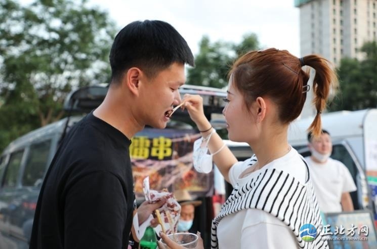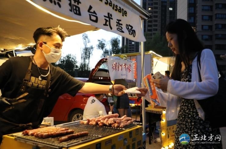 人間煙火氣,最撫凡人心。雖然已是21時(shí)許,但是后備廂集市依然人頭攢動(dòng),熱鬧非凡,叫賣聲不絕于耳。一家烤腸攤位前,攤主郭浩楠一邊招呼食客,一邊拿著夾子不緊不慢地翻動(dòng)著烤架上的烤腸,烤好后拿竹簽一穿,伴著滋滋作響的聲音,紅光透亮的烤腸瞬間香氣四溢?!耙呀?jīng)參加了好幾場了,一晚上能售出近百根烤腸,不過我的初衷不是為了賺錢,就是想把自己鐘情的美食分享給大家?!惫崎f。