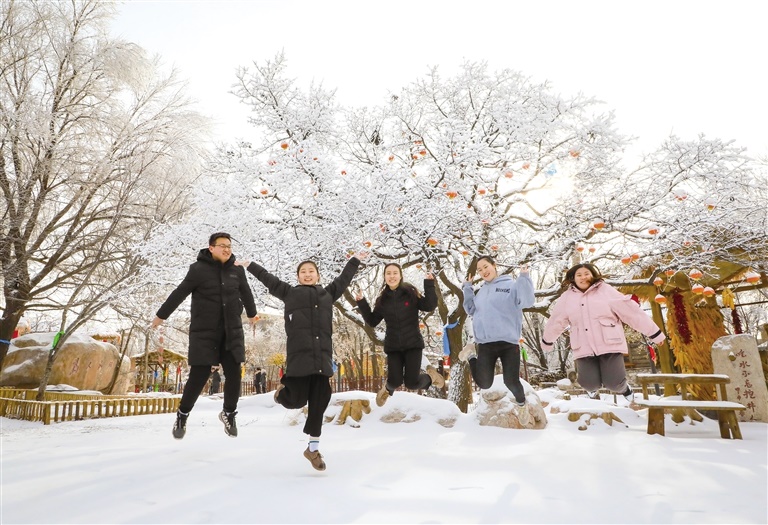 1月9日,首府市民在莫尼山非遺小鎮(zhèn)的霧凇前興奮地跳了起來(lái)。雖然近期首府并無(wú)明顯降雪,但在莫尼山非遺小鎮(zhèn)卻是銀裝素裹的一派隆冬景象,美麗的霧凇吸引了很多市民前來(lái)觀賞游玩。