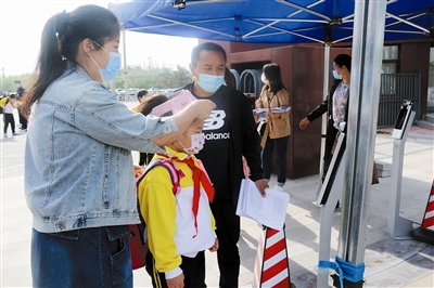 “等了這么久,終于可以和同學(xué)們說句:早上好。”6月2日,早上7點剛過,通遼新城第一中學(xué)小學(xué)部二年一班的班主任崔老師早早的在校門口,迎接班里的小朋友們。記者在校門口看到,此時,小學(xué)部二、三年級的小朋友已經(jīng)陸續(xù)入校了,顯然,“萌娃”們已經(jīng)被校門口的層層關(guān)卡震撼到了,幸好,在眾多老師的幫助和指引下順利進入了校門。進入了校門后,還有一道重要關(guān)卡,測量體溫,習(xí)慣了伸出手臂來測量體溫的“萌娃”們,對著紅外線測溫儀卻不知所措了,有的對著測溫儀伸出了手臂、有的對著測溫儀行禮,著實“萌”翻了現(xiàn)場所有人?!按蘩蠋煟覀兌枷肽懔??!币姷綆孜恍∨笥岩獪惖礁皟?,崔老師立刻提醒同學(xué)們:我也很想念你們,但是我們要保持“一米”的距離,快去教室吧!小朋友們被“殘忍”拒絕,很是失落。