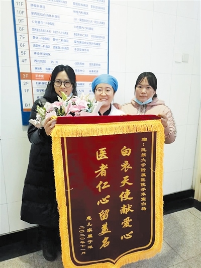 11月27日,當(dāng)孩子已經(jīng)好轉(zhuǎn)出院,王欣影沒有忘記那一夜遇到的好心人,她再一次撥通白楊的電話,此時(shí),她才得知白楊就是附屬醫(yī)院手術(shù)室的一名護(hù)士。她將一面寫有“白衣天使獻(xiàn)愛心醫(yī)者仁心留美名”的錦旗送到了白楊的手中,她說:女兒又多了一位媽媽。白楊也向記者講起了那晚的經(jīng)歷,她說:“其實(shí),那晚我是去接我丈夫的,由于暴雪,丈夫被困在了米家科技園附近,我開車去接他,在回來的路上,看到有車輛遇險(xiǎn),心想,這樣惡劣的天氣,遇到誰有困難就應(yīng)該幫一把,當(dāng)時(shí),我們也沒有多想,我也是做母親的,看到夫妻倆那么焦急,我只想把孩子快點(diǎn)送到醫(yī)院,好在有驚無險(xiǎn),孩子平安無事?!焙髞?,記者還了解到,當(dāng)把孩子送到醫(yī)院后,白楊已渾身濕透,待孩子已經(jīng)搶救上,安頓好王欣影后,已經(jīng)是凌晨5點(diǎn),天也蒙蒙亮了,白楊沒有回家,一夜未眠的她,留在了工作崗位上。