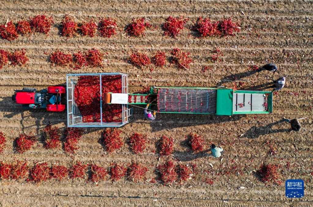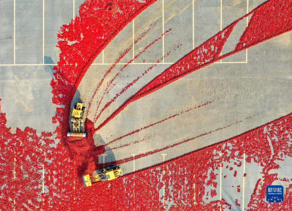 10月25日,在開魯縣東風(fēng)鎮(zhèn),工作人員駕駛鏟車收獲晾曬好的紅干椒(無人機(jī)照片)。新華社記者 連振 攝