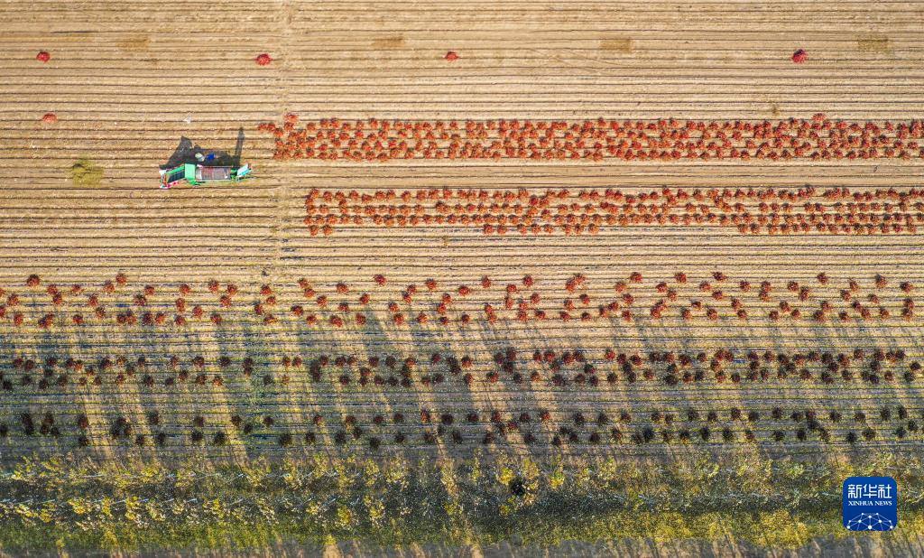 10月25日,在開魯縣東風(fēng)鎮(zhèn)東方紅村,村民在田間收獲紅干椒(無人機(jī)照片)。新華社記者 連振 攝