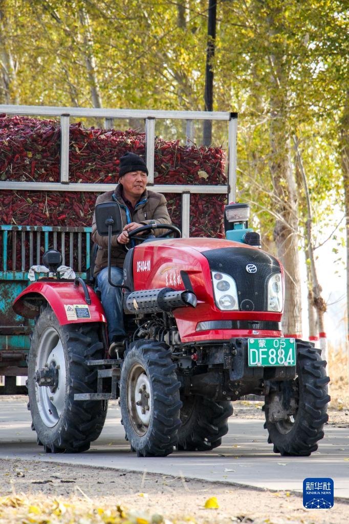 10月25日,在開魯縣東風(fēng)鎮(zhèn)東方紅村,村民駕駛拖拉機(jī)運(yùn)輸紅干椒。新華社記者 連振 攝