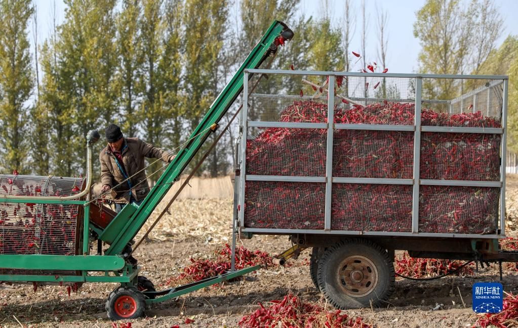 10月25日,在開魯縣東風(fēng)鎮(zhèn)東方紅村,村民在田間收獲紅干椒。新華社記者 連振 攝