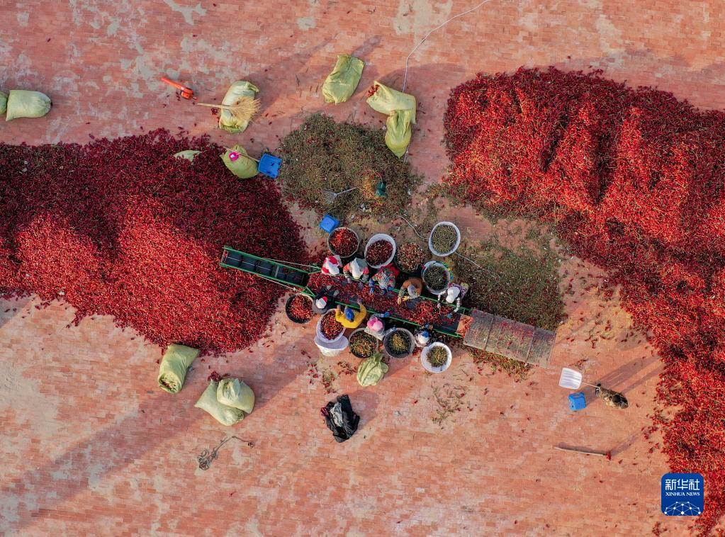 10月25日,在開魯縣東風(fēng)鎮(zhèn)東方紅村,工作人員分揀處理紅干椒(無人機(jī)照片)。新華社記者 連振 攝