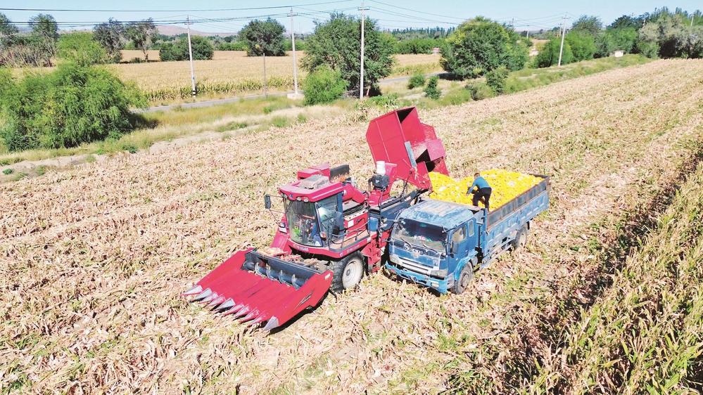 在烏達區(qū)烏蘭淖爾鎮(zhèn),農(nóng)機手駕駛收割機在農(nóng)田里收割玉米。