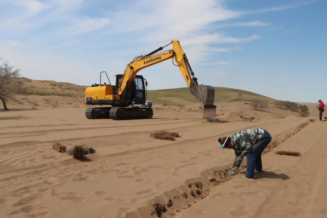 據(jù)錫林浩特市二蛋牧民養(yǎng)殖專業(yè)合作社負責人介紹,在傳統(tǒng)的沙漠治理作業(yè)中,工人需要手動栽植黃柳等固沙植物。然而,人工種植不僅效率低,勞動強度也大。為突破這一困境,合作社成員經(jīng)過多次試驗,最終決定對挖掘機進行創(chuàng)新改造,加裝叉具,這一巧妙的設(shè)計不僅實現(xiàn)了對黃柳種植深度和間距的精準把控,還能有效避免土壤翻動,最大程度地保持了土壤水分,切實保護了沙地的生態(tài)環(huán)境?! ?/p>