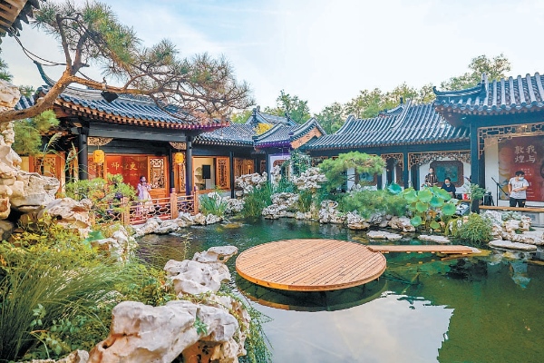 園中一泓池水,清澈如鏡,廊、軒、亭、榭環(huán)繞四周,夾岸有疊石、綠植、繁花,明朗清雅。后樓為展廳,中國當(dāng)代水墨藝術(shù)家彭薇的作品《有故事的房間》正在展出,觀眾散落其間,駐足欣賞。