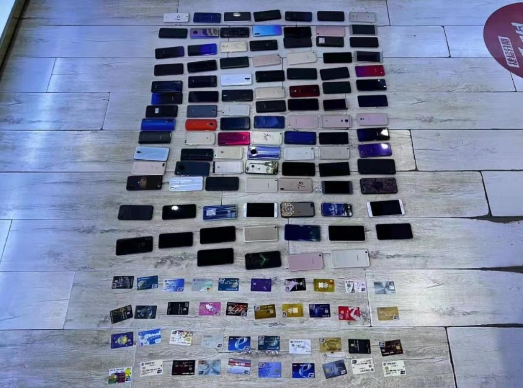 這是民警現(xiàn)場查扣的手機(jī)、銀行卡等部分作案工具。(受訪單位供圖)