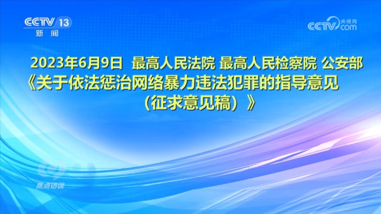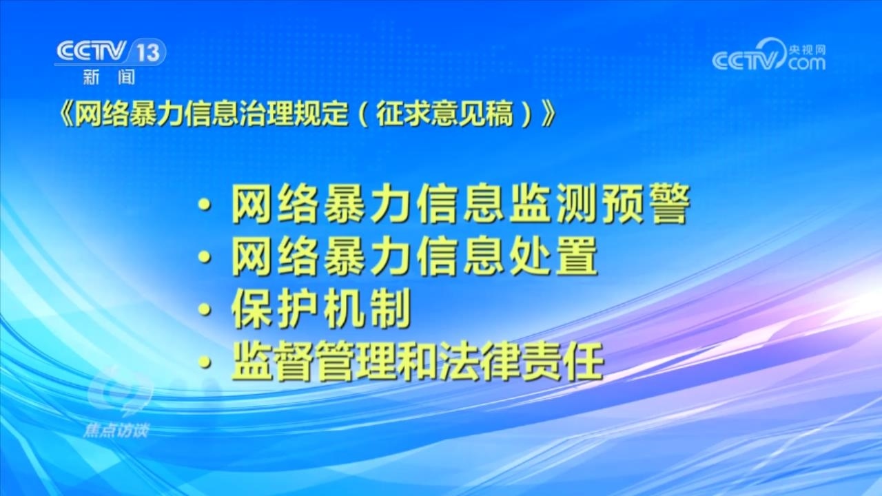 央視網(wǎng)消息(焦點訪談):俗話說“舌上有龍泉,殺人不見血”。網(wǎng)絡暴力不同于現(xiàn)實中的拳腳相加,但是這些在網(wǎng)絡空間中用文字、圖片等方式進行的傷害和侮辱,一樣可以對當事人的現(xiàn)實生活產生惡劣的影響,讓當事人的心靈“流血”。在傷害當事人的同時,網(wǎng)絡暴力行為也嚴重污染了互聯(lián)網(wǎng)環(huán)境,影響社會和諧穩(wěn)定。近日,國家互聯(lián)網(wǎng)信息辦公室起草了《網(wǎng)絡暴力信息治理規(guī)定(征求意見稿)》,向社會公開征求意見;同樣是針對網(wǎng)絡暴力,在6月,最高人民法院、最高人民檢察院、公安部起草了《關于依法懲治網(wǎng)絡暴力違法犯罪的指導意見(征求意見稿)》,面向社會公開征求意見。治理網(wǎng)絡暴力這顆“毒瘤”,營造良好生態(tài)勢在必行。