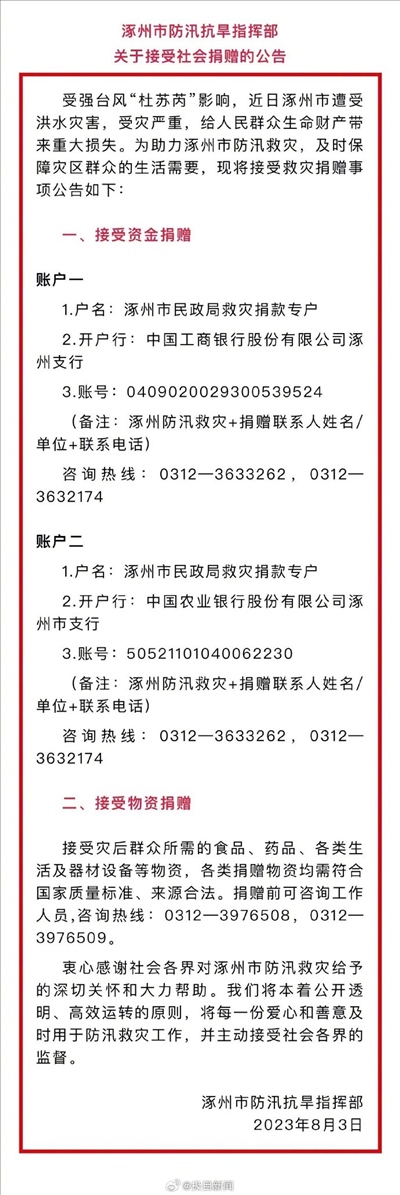 ·河北涿州接受社會捐贈,救災捐款專戶公開。