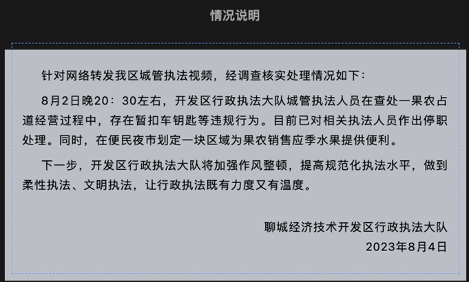 ·山東聊城通報“城管拔走小販車鑰匙”:相關執(zhí)法人員停職。
