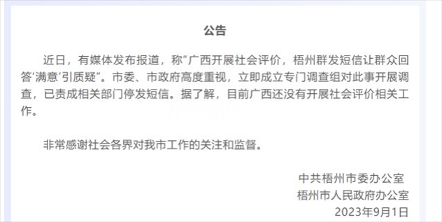 ·網(wǎng)傳廣西開展社會評價(jià),梧州群發(fā)短信讓群眾回答“滿意”,梧州市政府:開展調(diào)查,已責(zé)成相關(guān)部門停發(fā)短信。據(jù)了解廣西還未開展社會評價(jià)相關(guān)工作。
