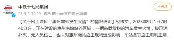 ·中鐵十七局集團(tuán)發(fā)布對“惠州南站發(fā)生火情”的說明:一輛裝載貨物的汽車發(fā)生火情,被迅速撲滅,未造成人員、財(cái)產(chǎn)傷亡。