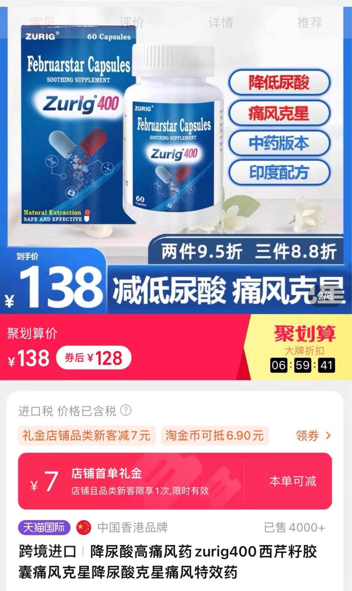 此外,zurig400在銷售頁面還模仿印度zurig80,宣稱降尿酸、痛風藥。澎湃新聞記者調查發(fā)現,zurig400目前在多個網購平臺有售,有商家顯示已出售4000+。 經了解后得知,印度zurig80實際上是一款仿制藥,目前國內并未獲批上市;而zurig400卻是一款香港產的保健品類目產品,并非藥品。但產品宣傳時卻使用“痛風特效藥”“印度配方”“中藥非布”等詞語,讓患者產生誤會。