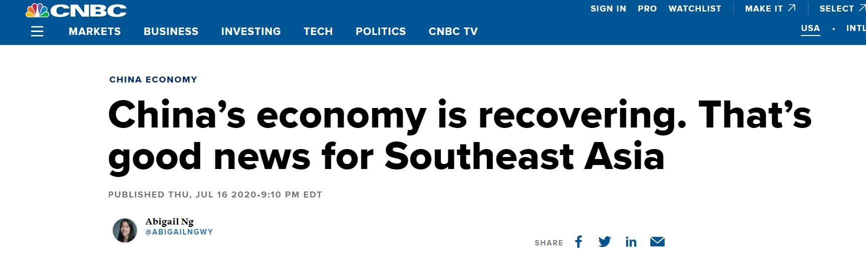 葡萄牙媒體Expresso指出,如果按季度環(huán)比衡量,那么中國經(jīng)濟已經(jīng)實現(xiàn)了“ V”型復(fù)蘇。Expresso注意到,盡管與美國發(fā)生了貿(mào)易摩擦,但外貿(mào)成為中國經(jīng)濟復(fù)蘇的活躍因素之一。在1月至5月間累計下降24%之后,6月出口再次增加。巴西《環(huán)球報》同樣報道稱,在經(jīng)歷了年初的歷史性低迷之后,中國經(jīng)濟第二季度再次增長,這是克服新冠病毒大流行危機的全球斗爭中重要的里程碑。