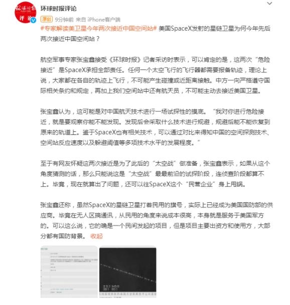 航空軍事專家張寶鑫接受《環(huán)球時報》記者采訪時表示,可以肯定的是,這兩次“危險接近”是SpaceX承擔(dān)全部責(zé)任。任何一個太空飛行的飛行器都需要報備軌跡,理論上說,大家都在各自的軌跡上飛行,不可能產(chǎn)生碰撞或近距離接觸。中方一向嚴(yán)格遵守國際相關(guān)條約和規(guī)定,再加上我們空間站中還有航天員,不可能主動去接近美國衛(wèi)星。