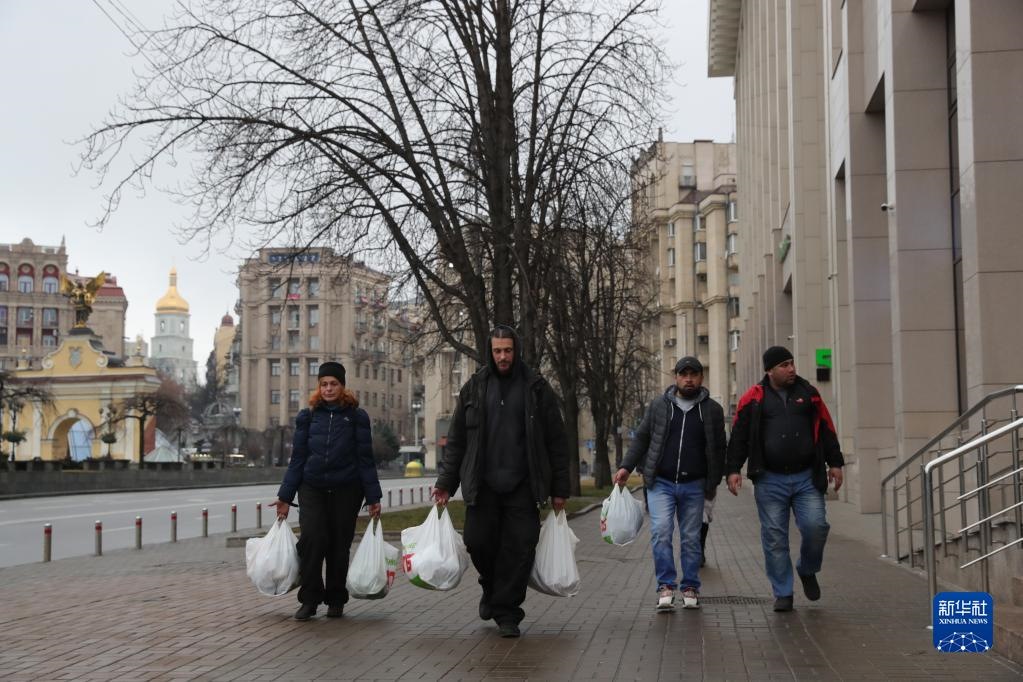 2月24日,在烏克蘭基輔,當(dāng)?shù)鼐用窳嘀少彽奈镔Y走在街道上。新華社記者 李東旭 攝