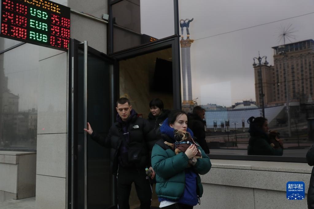2月24日,在烏克蘭基輔,當(dāng)?shù)鼐用駨囊惶帗Q匯點(diǎn)離開。新華社記者 李東旭 攝