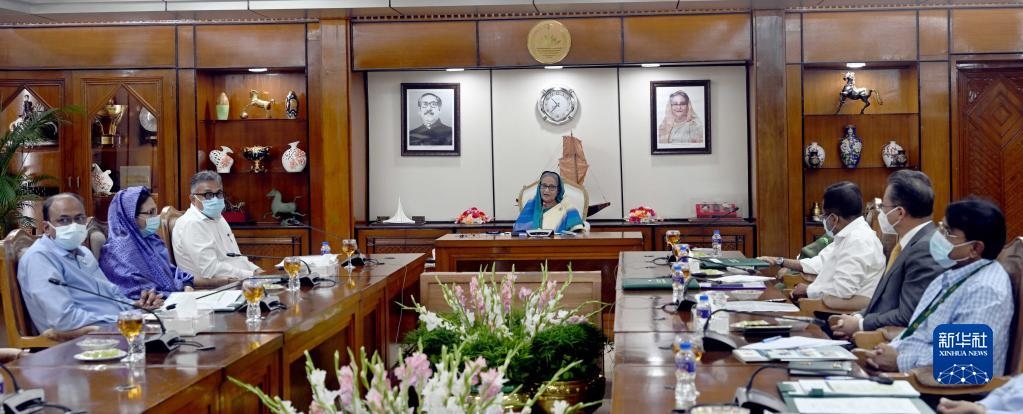 9月4日,在孟加拉國達卡,孟加拉國總理哈西娜(中)出席孟中友誼八橋啟用儀式。新華社發(fā)