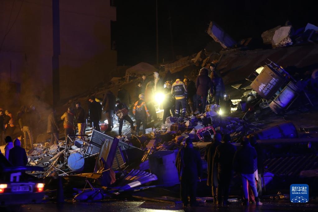 2月6日,在敘利亞拉塔基亞省杰卜萊,人們?cè)谝惶幍顾慕ㄖF(xiàn)場(chǎng)進(jìn)行救援。新華社發(fā)