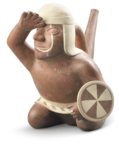 在展廳醒目位置,擺放著一件莫切文明時期(公元100年—800年)的戰(zhàn)士陶器,他皮膚深褐、高眉大眼、神情堅毅,腰間系著白色外衣,頭上戴著布帽。這名戰(zhàn)士身體微微前傾,跪坐在地,左手持盾牌,右手搭于額前,向著遠方眺望。這件戰(zhàn)士陶器身高雖不足20厘米,卻體態(tài)生動,僅使用簡練的線條與棕白兩色,便將一位莫切戰(zhàn)士形象刻畫得活靈活現(xiàn)。在雷瓜伊文明時期(公元前200年—公元650年)的動物陶器展臺前,總是有不少孩童圍繞。兇猛的美洲虎、呆萌的羊駝、神秘的未知生物,各種陶器與石器器身僅用黑、紅、白三色裝飾,形態(tài)各異、生動活潑,透過玻璃柜懵懂地望向千年后的小觀眾們。