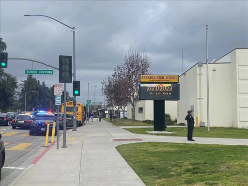 2月21日,美國(guó)加利福尼亞州洛杉磯縣,當(dāng)?shù)鼐浇拥綀?bào)警電話(huà)后一度封鎖了阿卡迪亞高中出入口。新華社記者高山攝