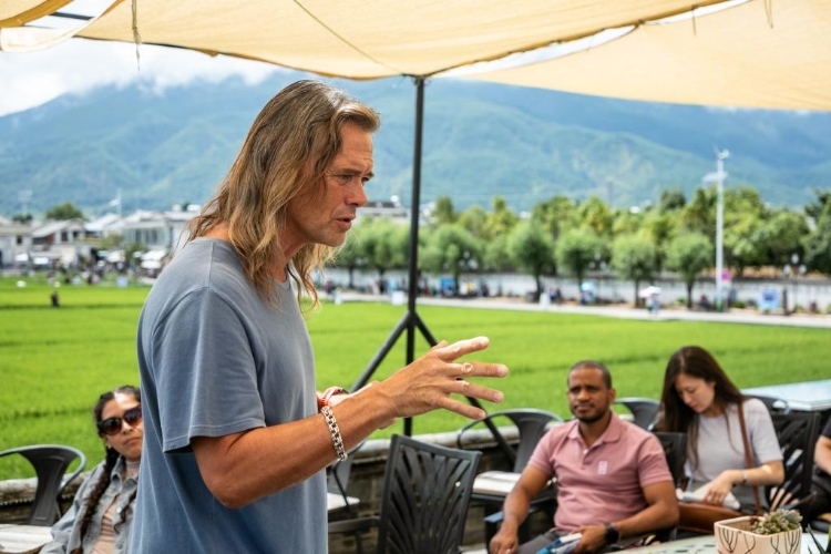 2022年8月27日,林登向外國訪客介紹大理當地文化。新華社記者曹夢瑤 攝
