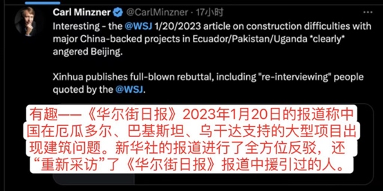 美國福特漢姆大學(xué)教授、美國外交關(guān)系協(xié)會(huì)中國問題高級(jí)研究員明克勝轉(zhuǎn)發(fā)了新華社的報(bào)道,并稱:有趣——《華爾街日?qǐng)?bào)》2023年1月20日的報(bào)道稱中國在厄瓜多爾、巴基斯坦、烏干達(dá)支持的大型項(xiàng)目出現(xiàn)建筑問題。新華社的報(bào)道進(jìn)行了全方位反駁,還“重新采訪”了《華爾街日?qǐng)?bào)》報(bào)道中援引過的人。
