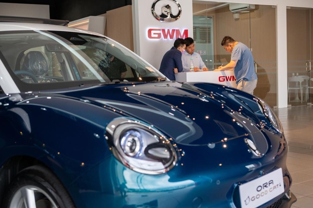 2月17日,在馬來(lái)西亞吉隆坡,一名顧客準(zhǔn)備試駕中國(guó)長(zhǎng)城汽車(chē)旗下的歐拉好貓新能源汽車(chē)。