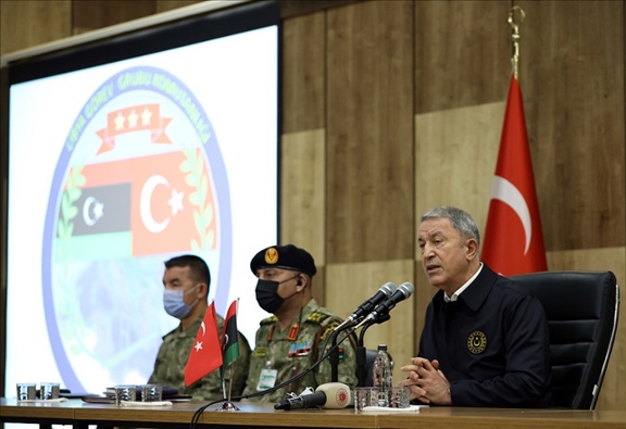 △2021年6月,土耳其國防部長阿卡爾(右)在訪問利比亞期間講話。