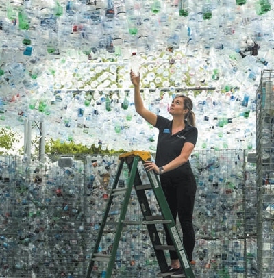 英國(guó)藝術(shù)家在倫敦動(dòng)物園打造名為“廢棄物空間”的藝術(shù)裝置,鼓勵(lì)人們停止使用一次性塑料瓶??巳R爾·多赫蒂攝(人民視覺(jué))