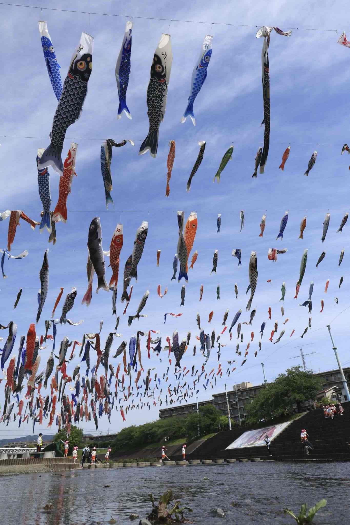當(dāng)?shù)貢r(shí)間2023年4月28日,日本大阪,大約1000條鯉魚旗在高摫市的秋田川河上空飄揚(yáng),慶祝5月5日兒童節(jié)。視覺(jué)中國(guó)