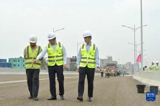 5月3日,姚堯(右)在孟加拉國達(dá)卡機(jī)場高架快速路項(xiàng)目上工作。新華社發(fā)