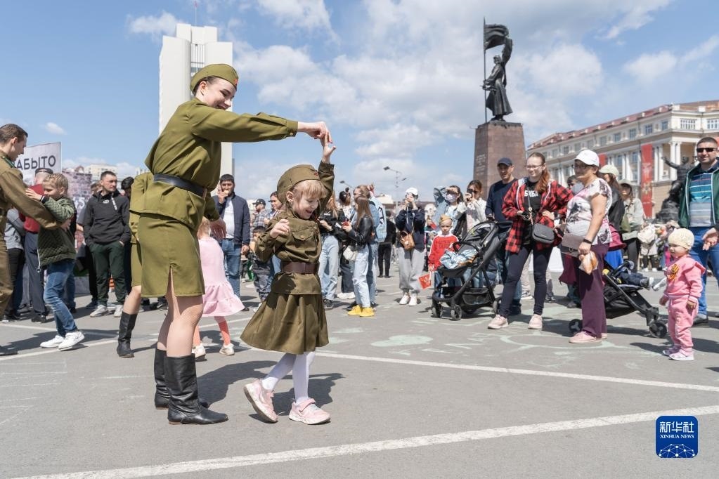 5月9日,在俄羅斯符拉迪沃斯托克,身穿模仿二戰(zhàn)時(shí)期蘇軍軍服的市民在廣場(chǎng)上跳舞。