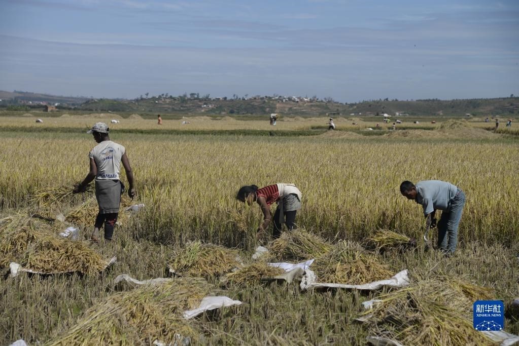 5月12日,在馬達(dá)加斯加首都塔那那利佛附近馬希奇鎮(zhèn)的中國國家雜交水稻工程技術(shù)研究中心非洲分中心,當(dāng)?shù)剞r(nóng)民在雜交水稻高產(chǎn)示范田內(nèi)收割水稻。