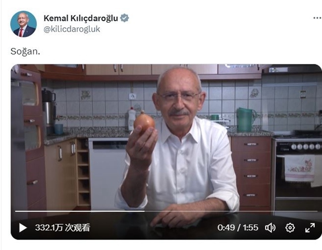↑克勒奇達(dá)爾奧盧在競(jìng)選廣告中手持洋蔥