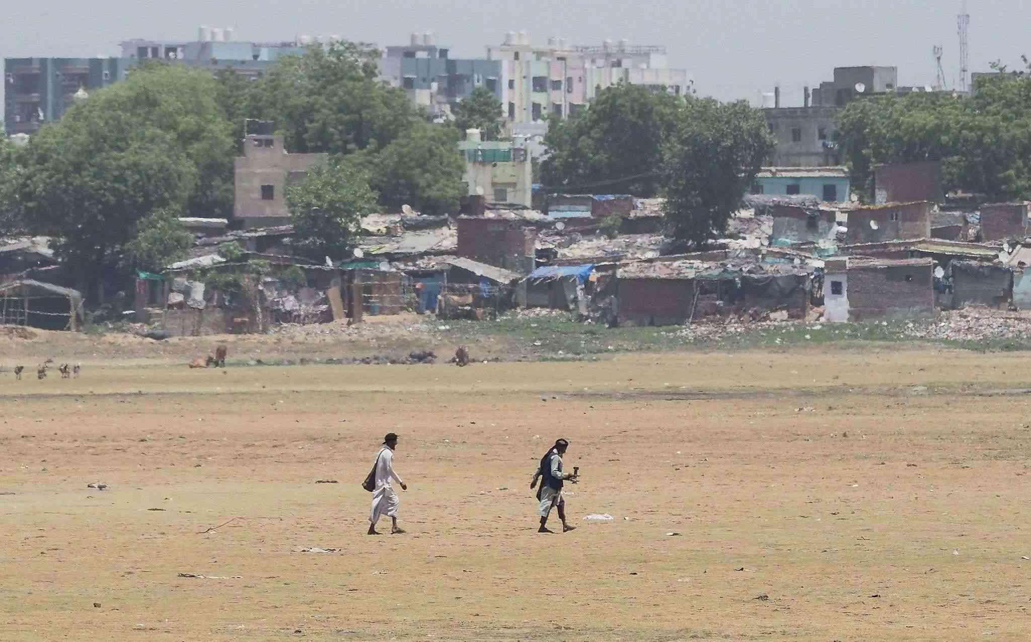 當(dāng)?shù)貢r間2023年5月10日,印度艾哈邁達(dá)巴德,人們走在干涸的河床上。