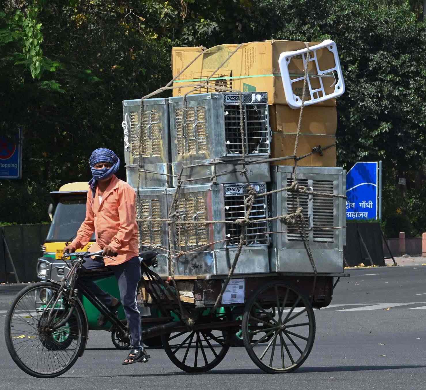 當(dāng)?shù)貢r間2023年4月16日,印度新德里,氣溫飆升至40℃以上,工人運送冷氣機(jī)。