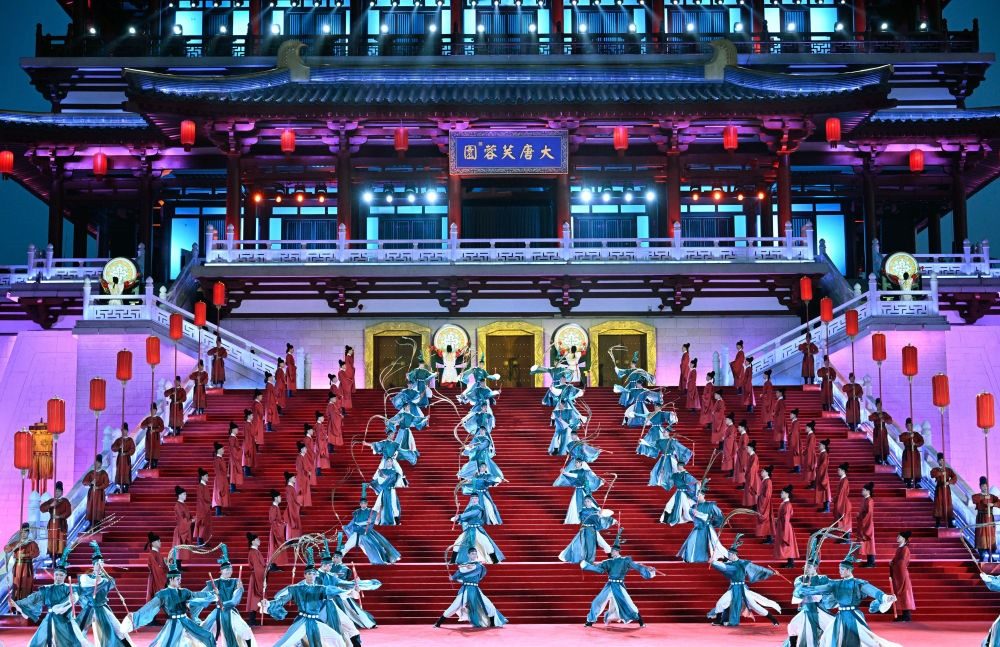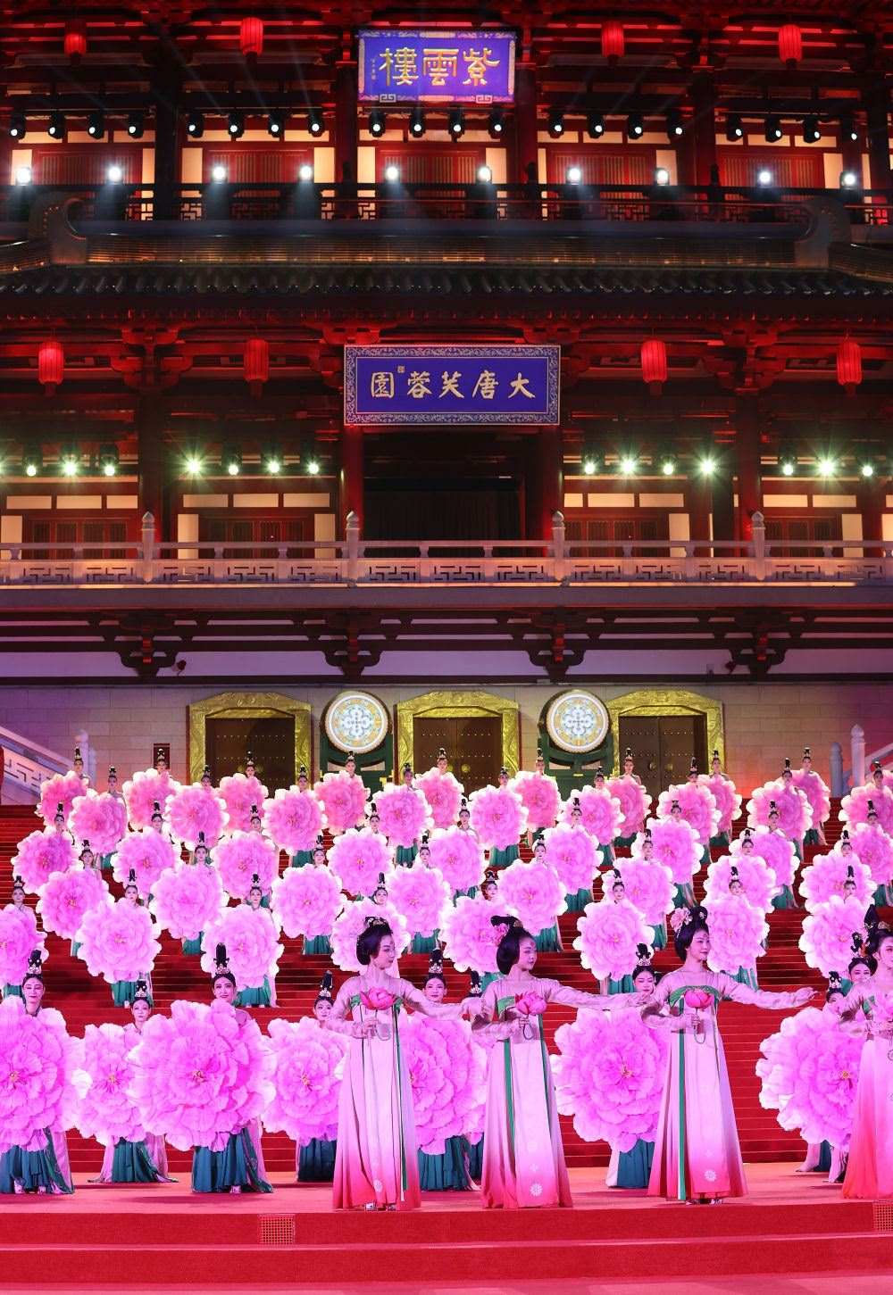 習(xí)近平夫婦為貴賓舉行唐朝傳統(tǒng)迎賓儀式。紫云樓前,禮樂和鳴,明快有力的古代佾舞、絢麗婀娜的芙蓉花舞,表達了古都西安人民的熱情好客,體現(xiàn)了中華文化兼容并蓄的精神風(fēng)貌。