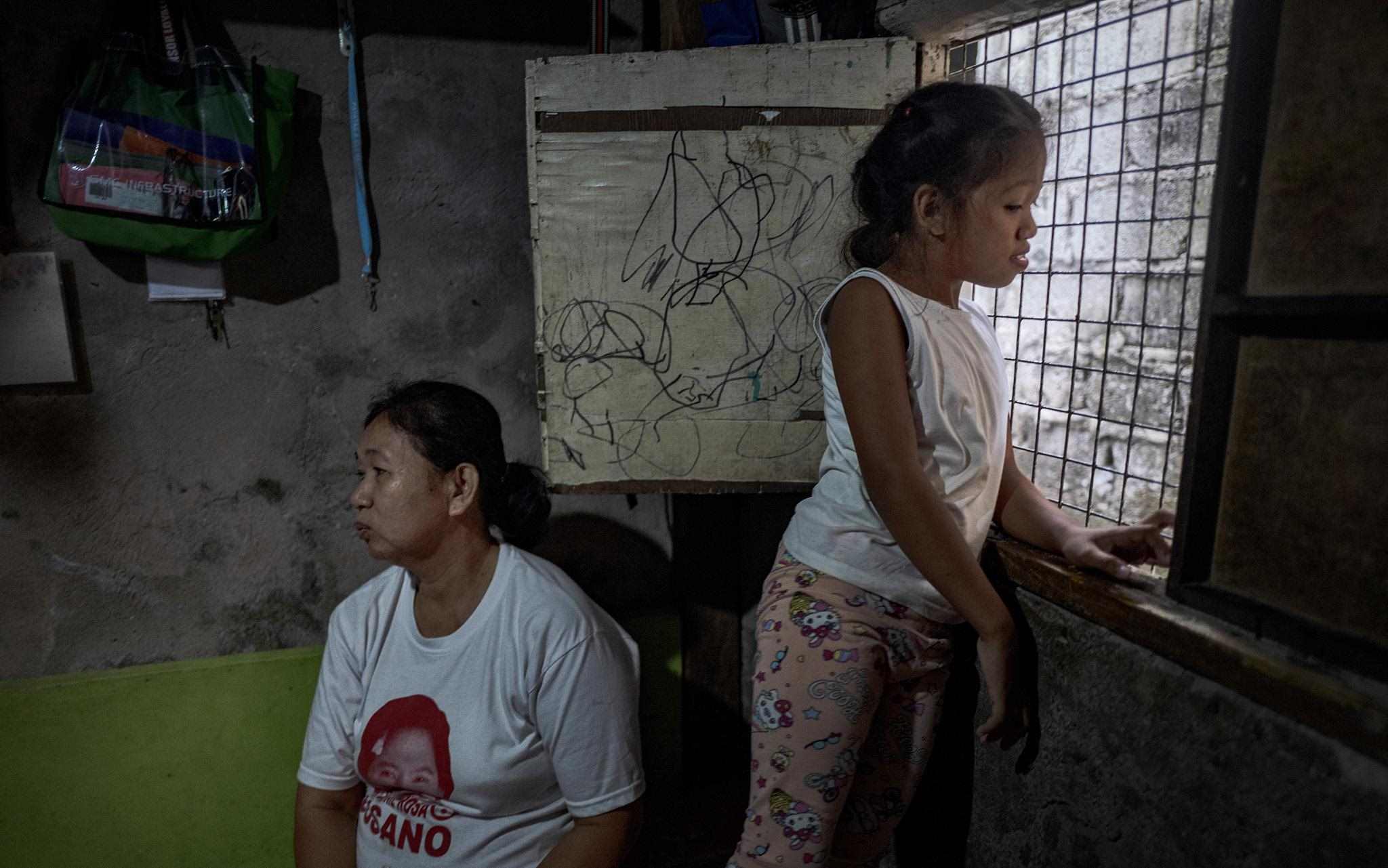 當地時間2023年4月15日,菲律賓馬尼拉,奎松市,Corazon Mercado(左)和她的女兒Bea坐在家里。據Corazon Mercado說:“我們買不起大瓶或散裝的必需品,我們只能買得起小袋的日常必需品?!?/p>