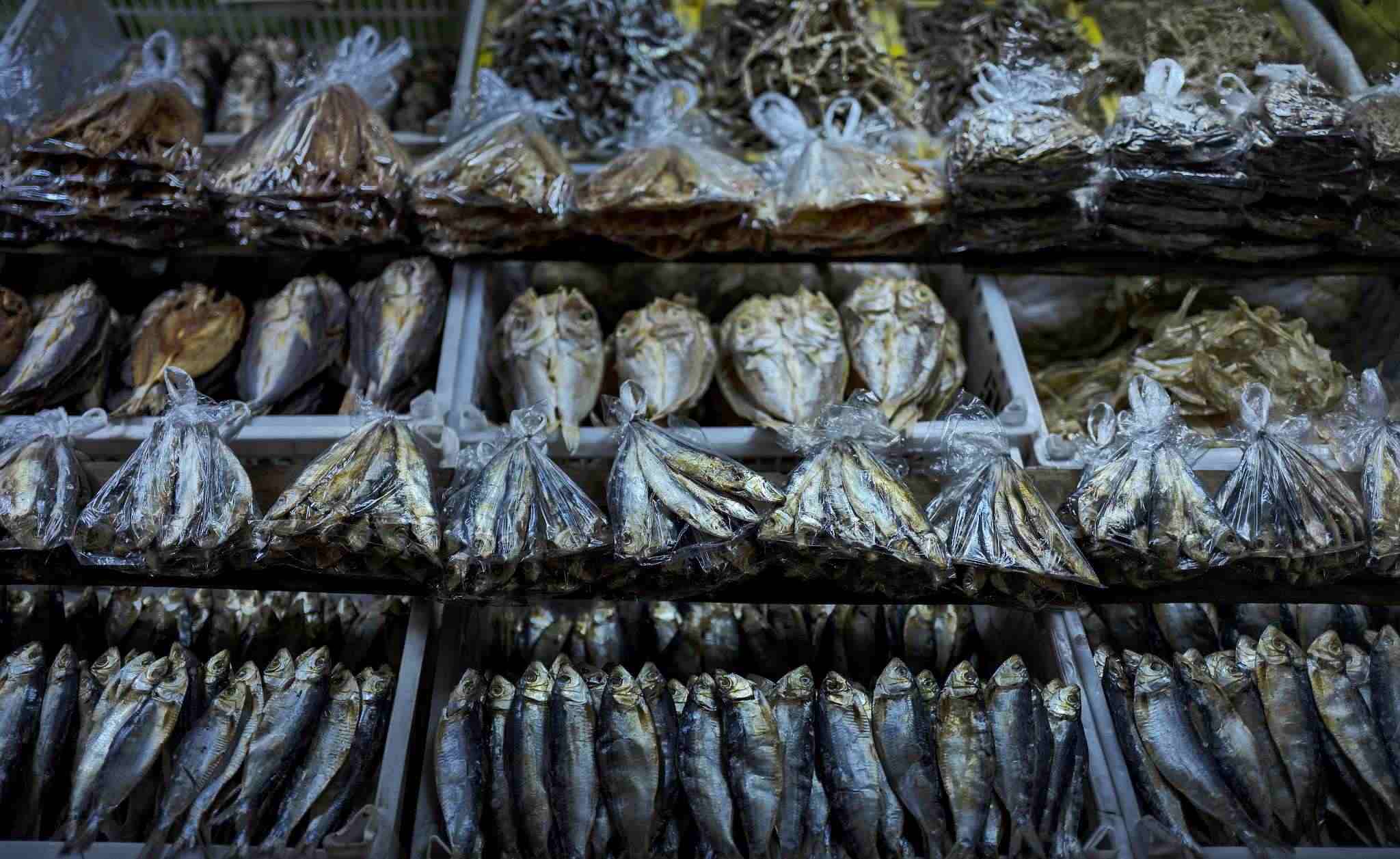 當地時間2023年4月19日,菲律賓馬尼拉菜市場上,用塑料袋包裹著的魚干。