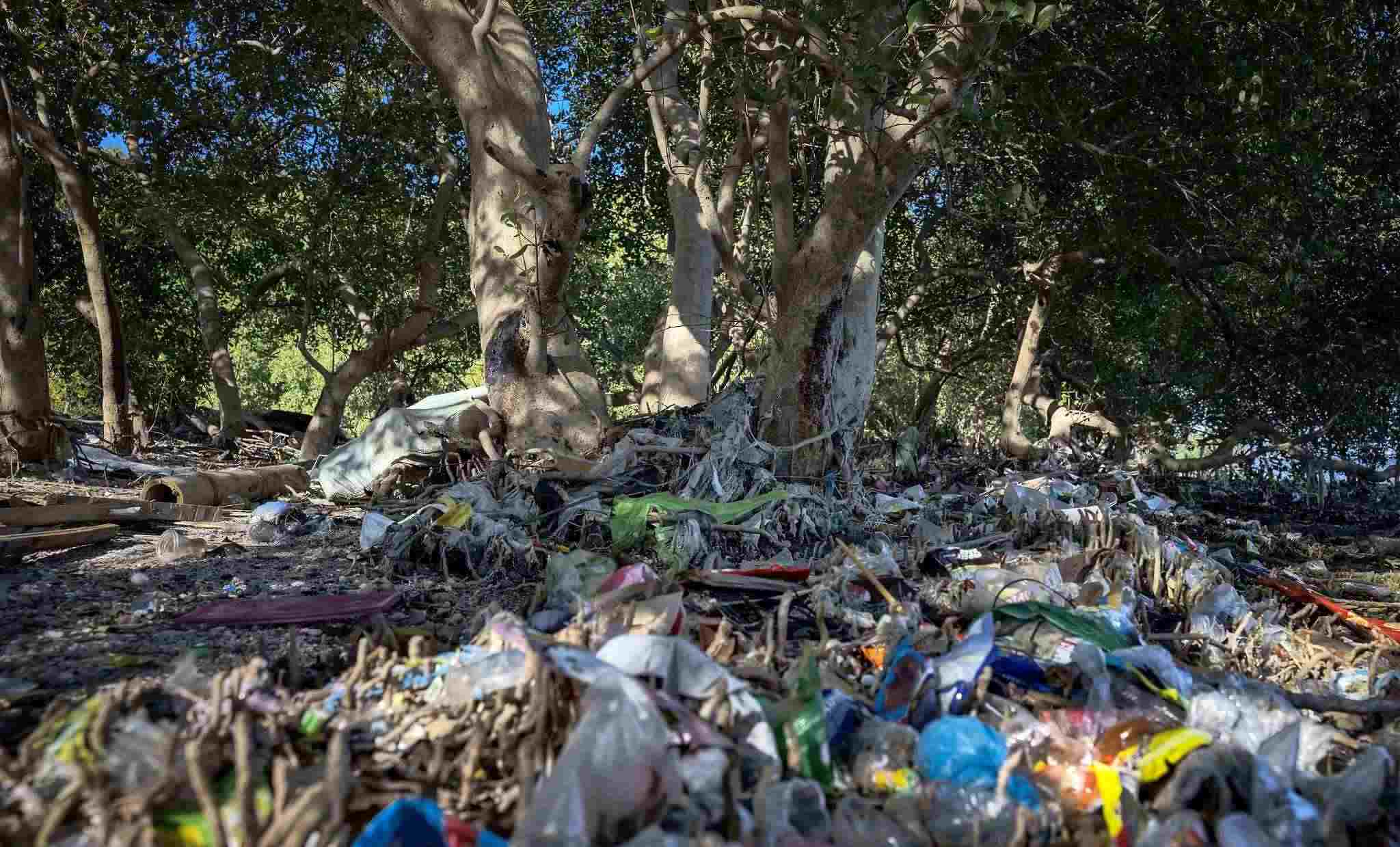 當地時間2023年4月19日,菲律賓馬尼拉,帕拉納克,自由島紅樹林上的塑料垃圾。