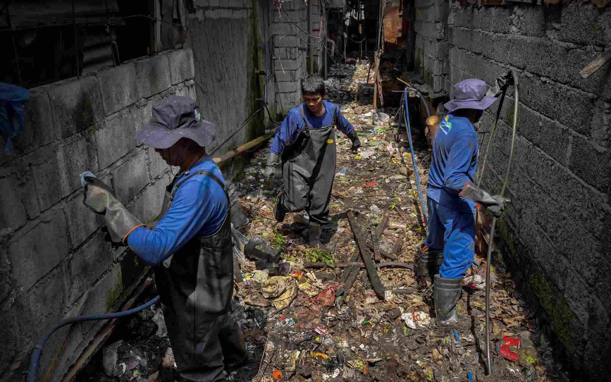 當地時間2023年4月15日,菲律賓馬尼拉,工人們清理一條被塑料垃圾堵塞的小溪。