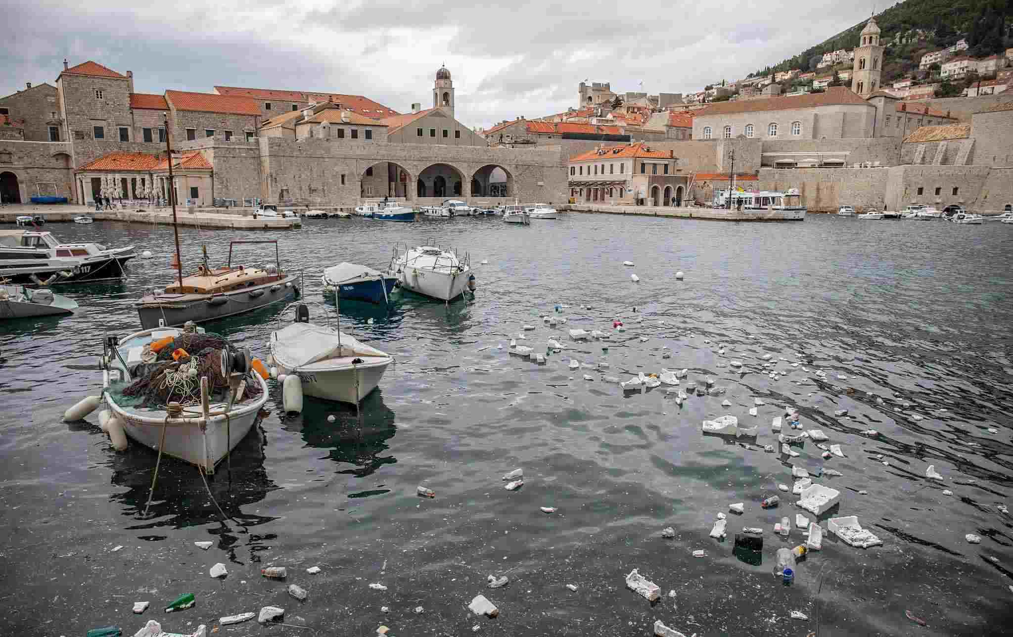 當地時間2023年2月27日,克羅地亞杜布羅夫尼克,大風過后,塑料垃圾漂浮在舊城港口。
