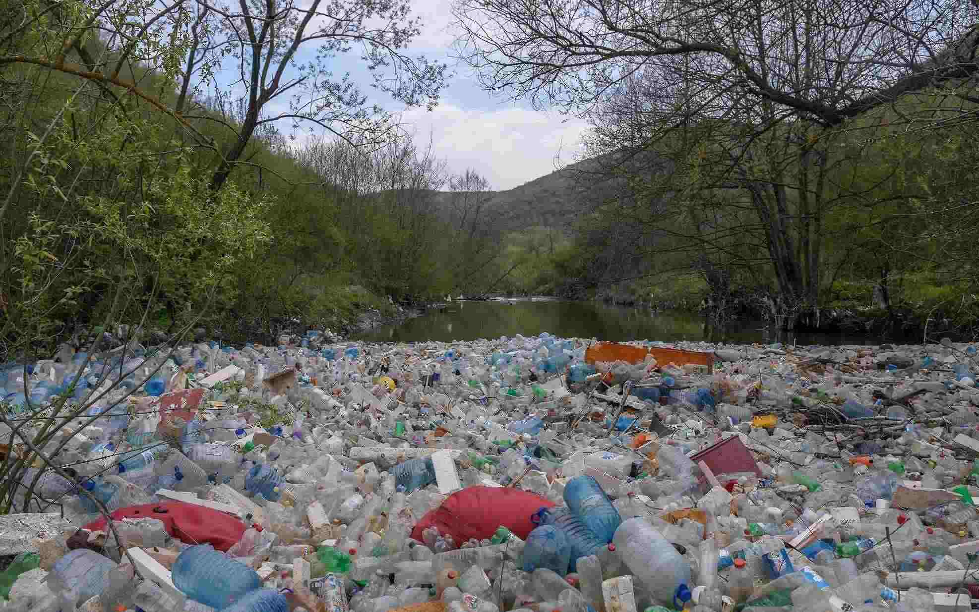 當地時間2023年4月22日,科索沃地區(qū),摩拉瓦河漂浮著大量廢棄的塑料瓶和其他垃圾。